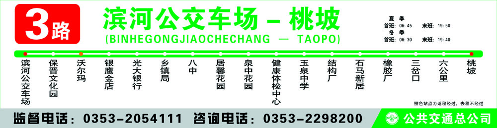濱河公交車場(chǎng) - 保晉文化園 - 銀鷹金店–光大銀行 - 鄉(xiāng)鎮(zhèn)局 - 八中 - 居馨花園 - 泉中花園 - 健康體檢中心 - 玉泉中學(xué) - 結(jié)構(gòu)廠 - 石馬新居 - 橡膠廠 - 三 岔口 - 六公里 - 桃坡