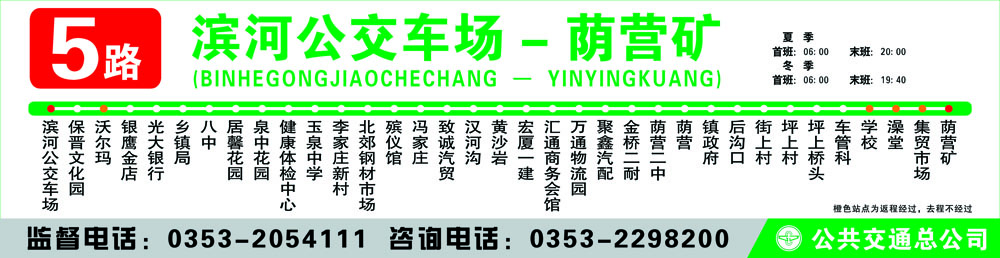 濱河公交車場(chǎng) - 保晉文化園 - 銀鷹金店 – 光大銀行 - 鄉(xiāng)鎮(zhèn)局 - 八中 - 居馨花園 – 泉中花園 - 健康體檢中心 - 玉泉中學(xué) - 李家莊新村 - 北郊鋼材市場(chǎng) – 殯儀館 - 馮家莊 – 致誠(chéng)汽貿(mào) - 漢河溝 - 黃沙巖 - 匯通商務(wù)會(huì)館 - 萬(wàn)通物流園 - 聚鑫汽配 - 金橋二耐 - 蔭營(yíng)二中 - 蔭營(yíng)廣場(chǎng) - 鎮(zhèn)政府 - 后溝口 - 街上 - 坪上 – 育才小學(xué) - 蔭營(yíng)礦車管科 - 學(xué)校 - 集貿(mào)市場(chǎng) - 澡堂 - 學(xué)校 – 劉備山